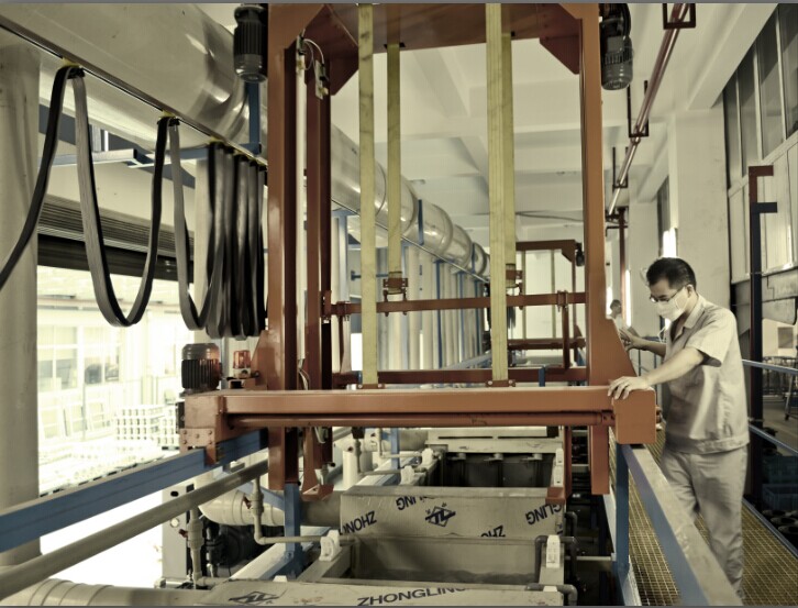 第一條生產(chǎn)線是2012年建成的,主要是對金工和腰輪的殼體、葉輪、機(jī)芯、轉(zhuǎn)子、端板、端蓋等關(guān)鍵零件進(jìn)行陽極氧化處理。對不同材料的殼體及零部件進(jìn)行陽極氧化處理時(shí),其電解液溫度、電壓和工序是不同的,工藝要求也不一樣,需要進(jìn)行分批處理。如:金工車間殼體進(jìn)行硬質(zhì)陽極氧化時(shí),溶液內(nèi)溫度要調(diào)至6~9度;而腰輪車間G10~G400-4〞 殼體進(jìn)行硬質(zhì)陽極氧化時(shí),溶液內(nèi)溫度是0度;另外,在進(jìn)行硬質(zhì)陽極氧化之前還要放入酸洗槽,進(jìn)行化學(xué)拋光處理。這樣,不僅操作工序繁雜,而且時(shí)間上也比較漫長,效率不是很高。因此,現(xiàn)增設(shè)了第二條陽極氧化生產(chǎn)線,運(yùn)行后,可以兩邊同時(shí)進(jìn)行陽極氧化處理,工作效率得到了明顯的提高。